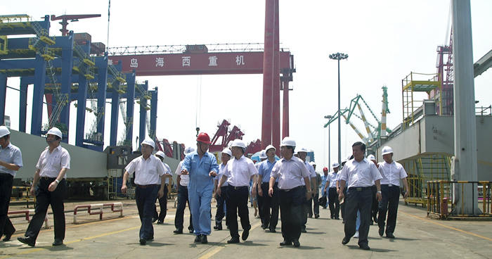在海西重機總裝現場,張德平副市長實地考察了待批量發往黎巴嫩的岸橋和輪胎吊項目、發往馬來西亞的帶斗門機項目、發韓國鮮光新港的軌道吊項目及承制、調試的功能性海工平臺項目等。并聽取了海西重機董事長孫國慶關于企業上半年經濟運行情況、轉型升級取得的成績以及在目前經濟形勢下的合同承接情況。