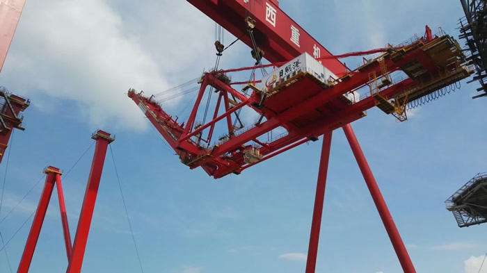 公司生產基地參觀同樣火爆:適逢總裝現場70T-60M岸邊集裝箱起重機項目整體吊裝, 1600T龍門吊平穩吊起850噸的前后大梁、緩緩上升、精準定位、穩穩落于該岸橋的門框上,現場高效的安裝工藝,給了在場的400余嘉賓巨大的視覺沖擊,掌聲、贊美聲陣陣不斷。公司整體室內噴涂的涂裝工藝、超大型設備整機滾裝運輸的軟硬件實力也讓參觀嘉賓耳目一新。