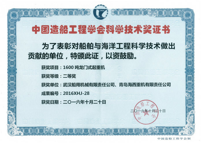 近日,中國造船工程學會傳來喜訊,我司《1600噸龍門式起重機》榮獲科學技術二等獎。這是青島海西重機在船舶與海洋工程領域獲得的又一項具有較高影響力的榮譽。
