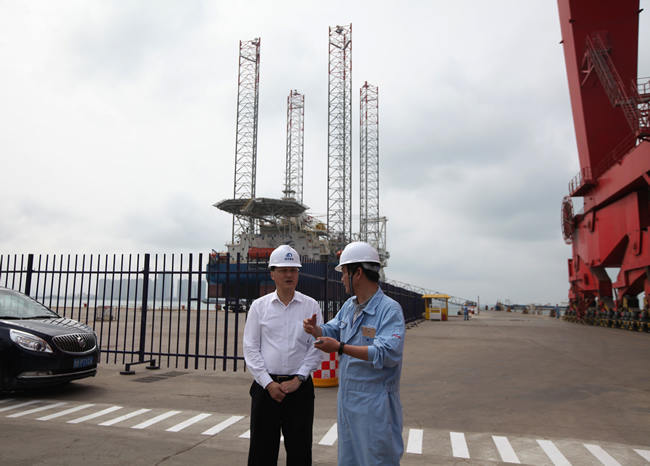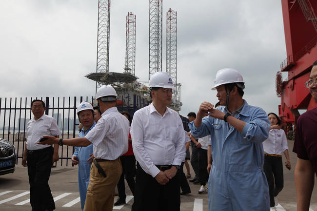 楊軍一行參觀了海西重機港口設備總裝現場,并重點參觀了在建的阿聯酋110米桁架自升式海工平臺,聽取了海西重機董事長鄧振山對公司目前生產經營形勢、生產負荷情況等方面的介紹,對海西重機在國際海工平臺市場上所取得的成績給予了肯定。