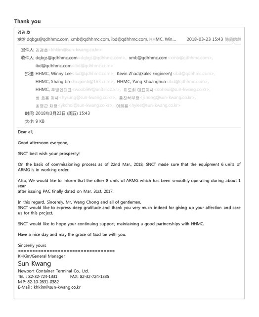 3月21日,海西重機(HHMC)為韓國鮮光新港集裝箱碼頭有限公司(SNCT)制造的6臺40噸自動化軌道吊順利交付投產。