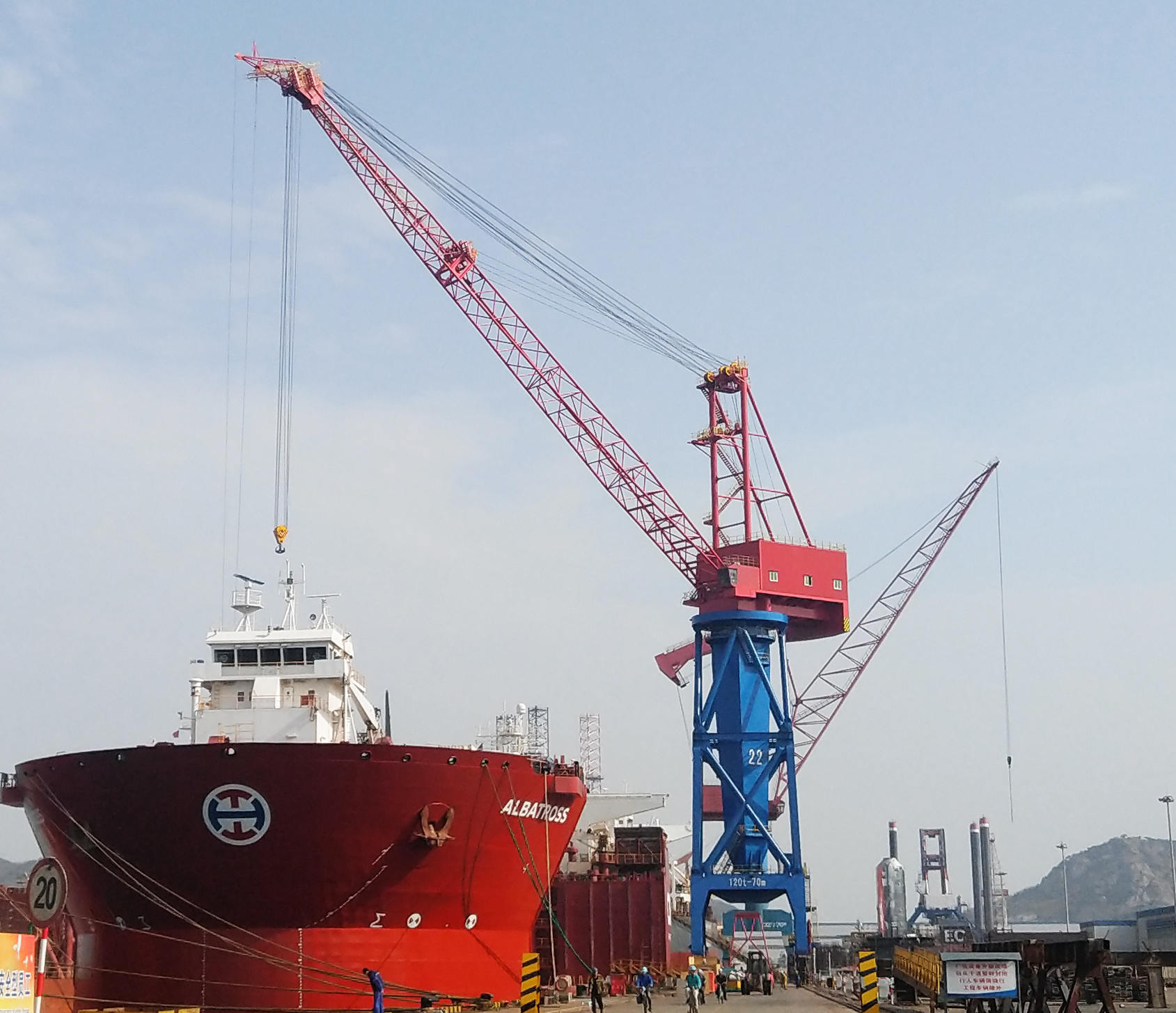 該門機自重約1200噸,門架結構為雙層八撐桿形式,回轉支承裝置為轉柱式,變幅形式為單臂架鋼絲繩變幅,主鉤起重量為120噸,最高起升高度108米,變幅幅度為23米-70米,主要用于船舶洗滌塔改造。