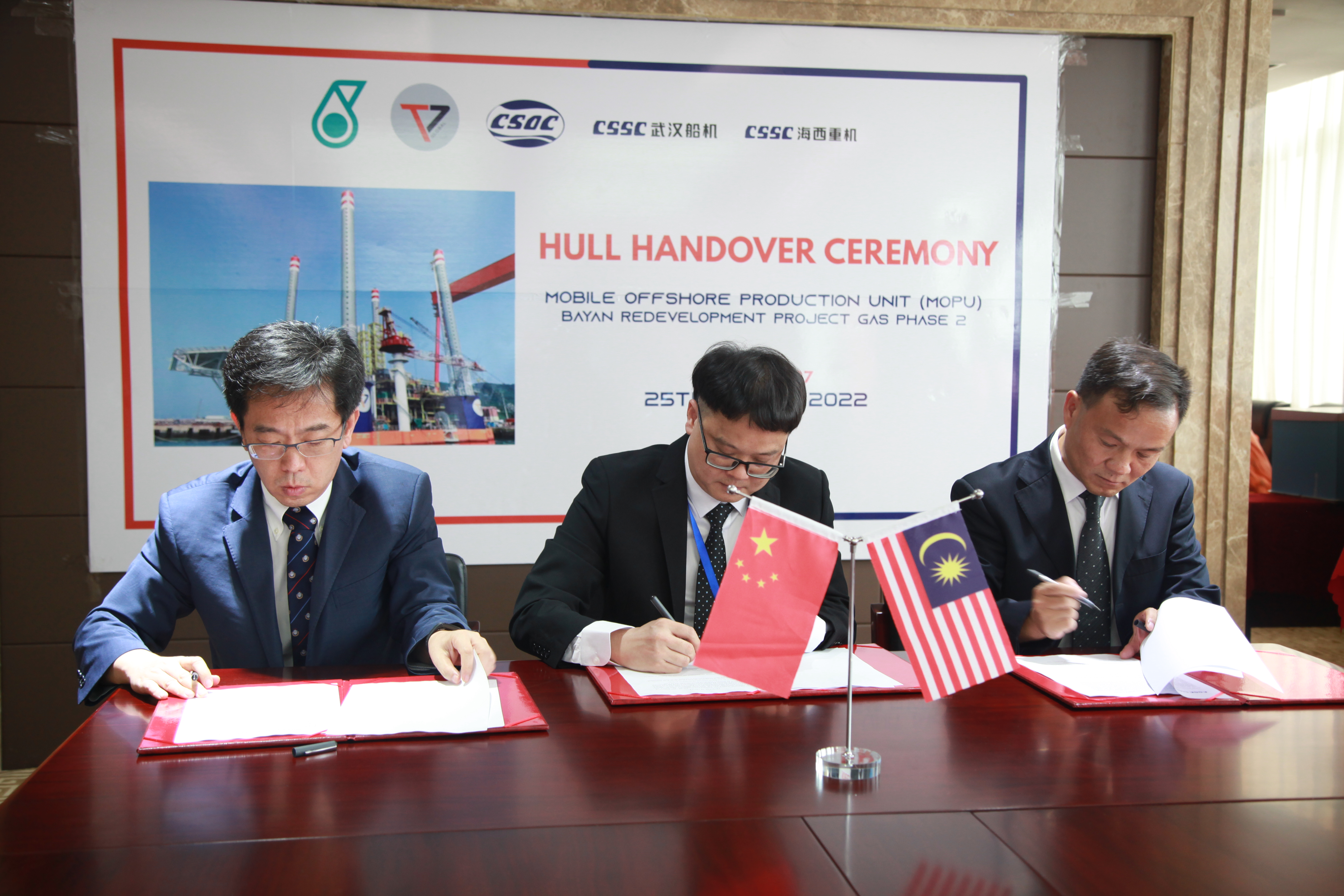 8月25日下午,由武漢船用機械有限責任公司總包,青島海西重機有限責任公司建造的馬來西亞可移動自升式生產(天然氣)平臺(簡稱MOPU)在中國船舶旗下武漢船機海西重機公司順利舉行交付簽約儀式,船東Tanjung Offshore、中國船貿和ABS船級社共同出席。