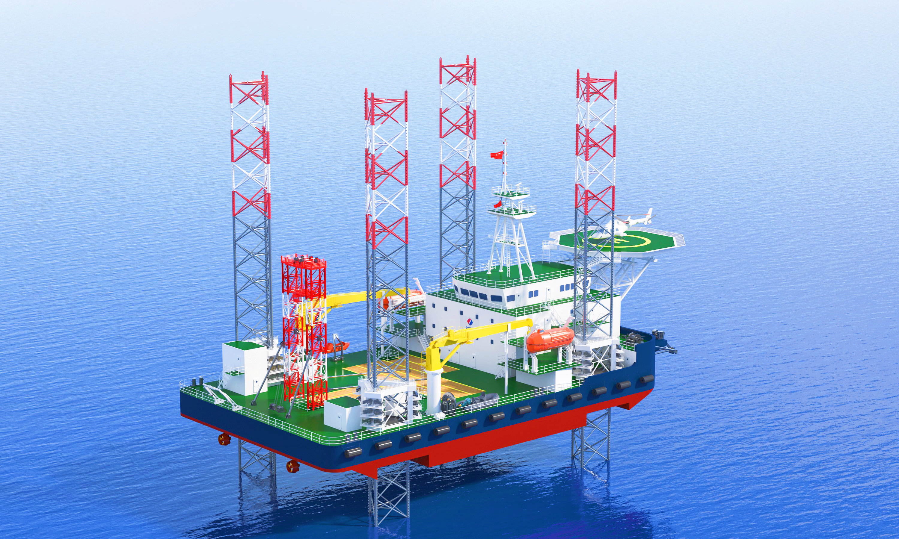 該平臺入級CCS,為鋼質四樁腿自升式,采用電動齒輪齒條升降系統,由平臺主體、樁腿(帶樁靴)、升降系統、推進系統、DP-1 動力定位系統、太陽能光伏、勘測試驗設備設施等部分組成。平臺樁腿全長約100米,最大作業水深75米,是國內作業水深最深的勘測試驗平臺,主要用于海上工程勘測一體化作業及科研,包括鉆探、原位測試、物探、土工試驗等全作業流程。