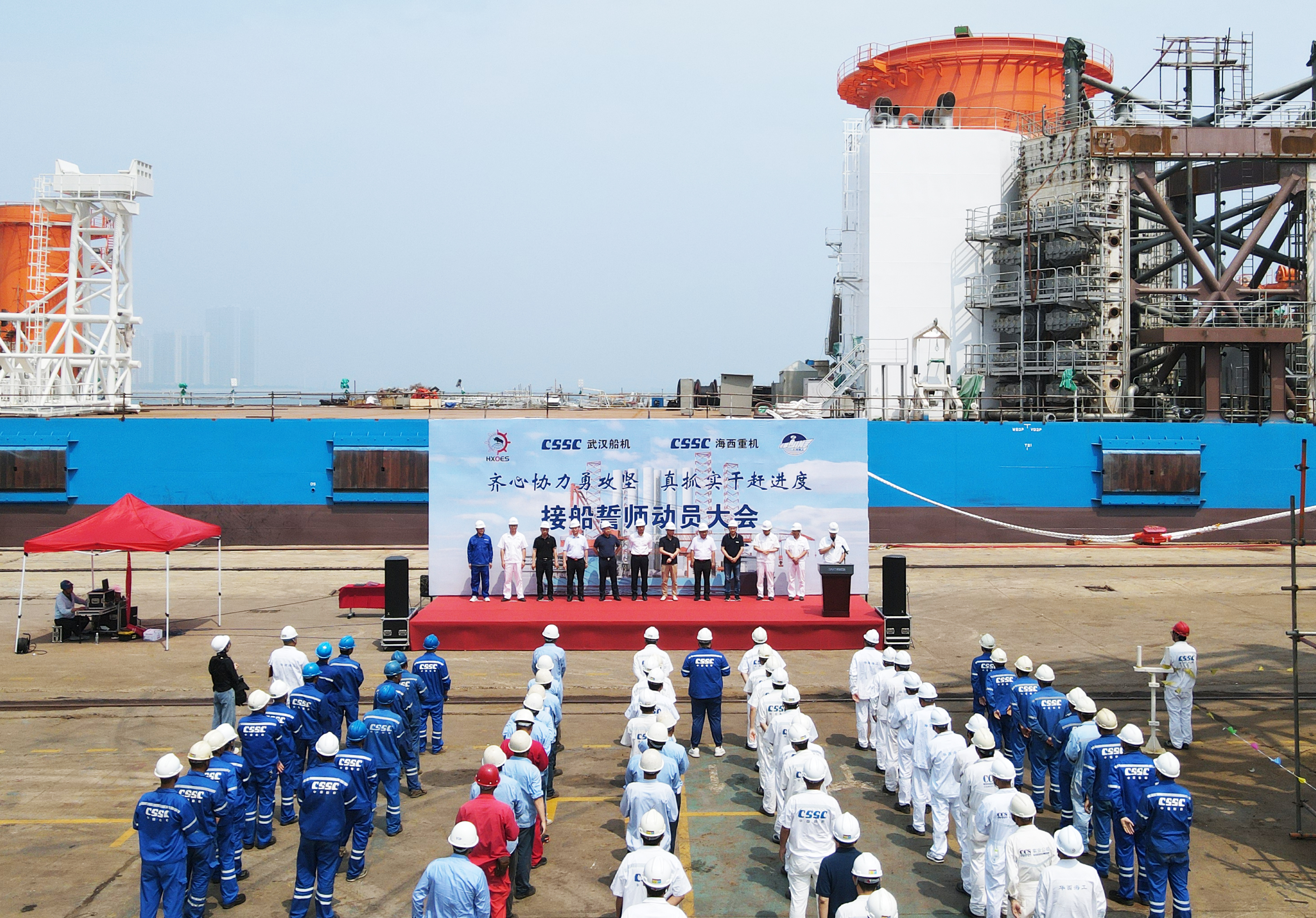 武漢船機公司黨委書記、董事長馬聚勇作了動員講話。馬聚勇強調,華西海工1600T風電安裝平臺項目作為公司承接的最新一代風電安裝平臺,能夠滿足未來深遠海、大容量、一體化施工要求,對公司打造經(jīng)典產(chǎn)品、引領未來市場發(fā)展具有重要戰(zhàn)略意義。自項目正式啟動以來,面臨著技術新、難度大、工期緊等諸多挑戰(zhàn),今天的誓師大會,是前期各參建單位克服重重困難、辛勤努力的結果,更是后期堅定信心決心、保質按期交付的體現(xiàn)。后續(xù),華西海工平臺將在海西碼頭完成樁腿接樁、升降調試、吊機調試、系泊試驗、航行試驗等重要工作,各方要頂住壓力、團結合作、高效運作,以背水一戰(zhàn)的決心和一往無前的奮戰(zhàn),完成船舶建造最后的沖刺工作。各方在生產(chǎn)過程中,必須牢記安全與質量意識,忙而不亂,快而有序,在確保安全生產(chǎn)和工程質量的前提下,全力以赴按節(jié)點保質保量完成。