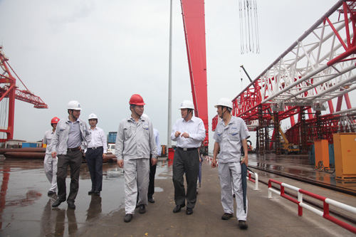 在參觀公司現場建成自用的1600噸龍門吊項目、正在吊裝上船的3600噸全回轉浮吊項目、面對公司的120米突堤碼頭以及繁忙的生產組裝現場,董總對公司的經營發展態勢予以充分肯定。他說:在當前市場經濟低迷的形勢下,青島海西重機能夠抓住發展機遇,逆勢而上,尤其在技術創新和產品開發方面發揮了自身潛能,具有前瞻性和市場眼光,更是武漢船機公司在船市低迷的情況下,產品結構調整的有力體現。董總特別對近期在煙臺、連云港、海南洋浦等港口項目投標中,我司與上海振華同臺競標并連續奪得標的給予了高度肯定。