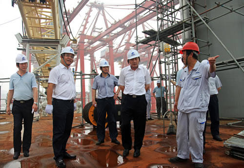 7月15日,中船重工副總經(jīng)理董強(qiáng)深入海西重機(jī)生產(chǎn)現(xiàn)場,查看了在制的90米自升式海洋平臺項(xiàng)目、為海南洋浦批量研制的岸橋、輪胎吊項(xiàng)目以及出口意大利的超巴拿馬岸橋(60t-62m岸橋)項(xiàng)目等,并就產(chǎn)品種類調(diào)整實(shí)效、安全生產(chǎn)責(zé)任制落實(shí)等與各級干部進(jìn)行交流,提出了指導(dǎo)意見。
