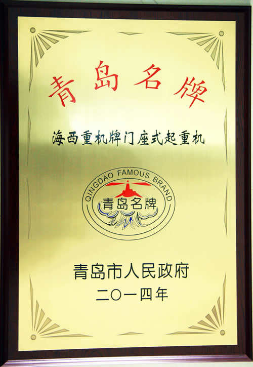 近日,海西重機門座式起重機被青島市人民政府授予“青島名牌”榮譽稱號,并頒發證書。